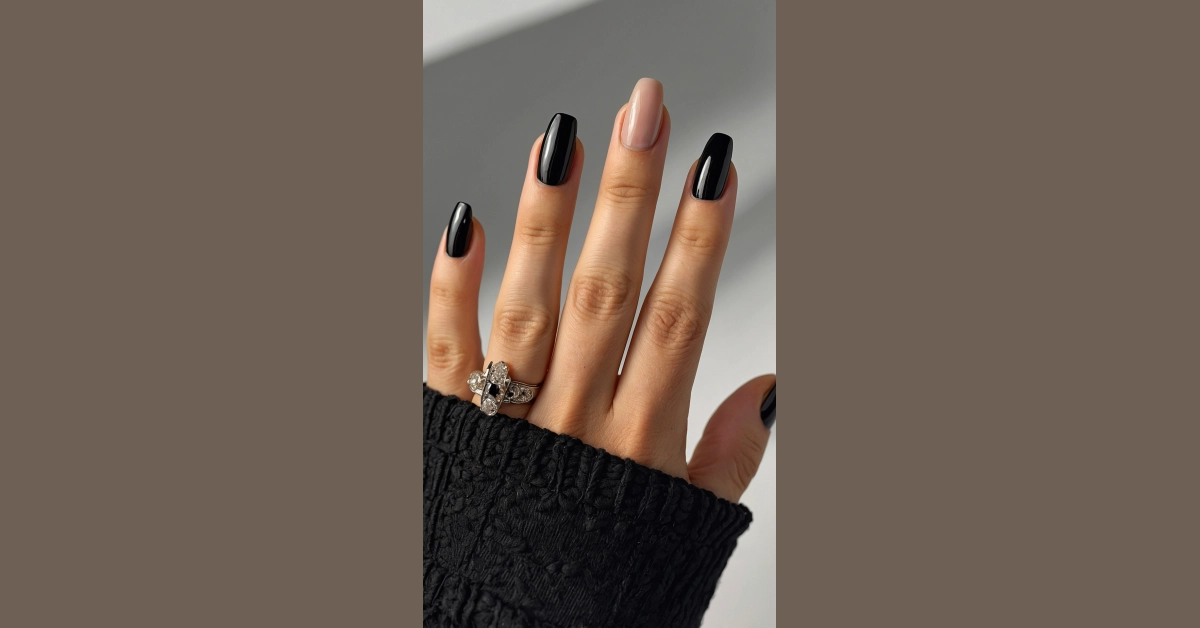 These black nails are absolutely rocking it, looking sleek and super cool like they just walked off a fashion magazine cover. But wait, what’s that? One finger decided to throw a curveball with a gorgeous nude polish! It’s like the squad of black nails went for a super edgy look, and that one nude nail is the surprisingly chill friend who still manages to look effortlessly stylish and totally belong. It’s giving us serious “I’m sophisticated, but I also know how to have fun” vibes, making a classic color combo feel totally fresh and unexpected.