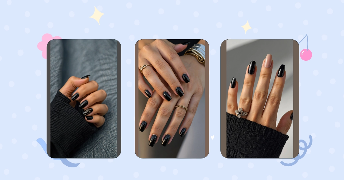 Who said black nails had to be super serious? These glossy black beauties are absolutely rocking tiny golden leaf-like decorations, making them look like a fancy secret garden party is happening right on your fingertips. They’re sleek and dramatic, but those little golden details add a touch of sparkle and fun, proving that black nails can be both edgy and totally ready for a picnic, a school dance, or just holding your phone while you scroll through TikTok. They’ve definitely mastered the art of looking effortlessly cool and cheerful all at once!